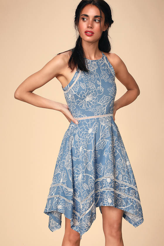 Lulus Exclusive! Get ready to slip into vacation mode when you wear the Lulus Bahama Mama Blue Floral Print Sleeveless Handkerchief Dress! Lightweight and breezy woven fabric, covered in a lovely white floral print, forms a high apron neckline atop a darted, sleeveless bodice atop an skater skirt with a flowy, flaring handkerchief hem. Pierced embroidery accents the neck, arm openings, fitted waist, and skirt for a bit of Boho detail. Hidden clasp/zipper at back.
